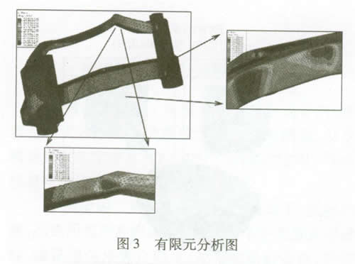 ⑵ 制动钳支架:通过有限元计算分析(FEM),在考虑减轻重量的前提下,设计最合理的制动钳支架形状;