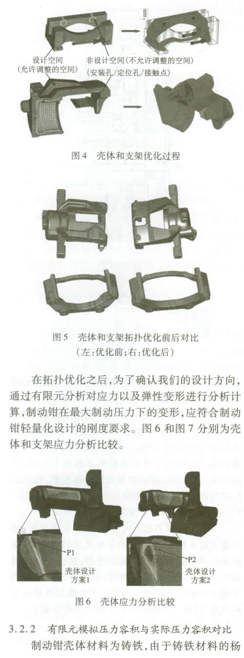 目标是保证产品性能、整体不能变形的同时对制动钳壳体和支架进行轻量化设计。采用拓扑优化方法可以使材料达到最合理的分布,应力分布也更加均匀。考虑到零件试验需要大量的模具投入,利用公司的有限元分析(FEM)能力;进行了一系列模拟工作。