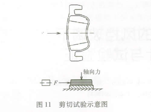 压缩性试验是在常温下6次加压至16 MPa,采用一种与该摩擦片相配套的活塞的替代物压在底板上,检测其压缩性。剪切试验如图11所示是施加规定的轴向力至摩擦材料从底板上脱落,读出剪切力的大小,同时目测光滑脱落面积,相关的标准对脱落面积进行评价。