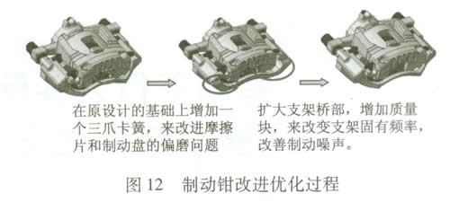 不同于国产化产品,FS浮式制动钳是由SABS主导自主开发的新产品,作为公司的一个重要产品系列,应用到现有产品中来,凭借高性能低成本的优势为更多的整车厂服务,占领更多的国内市场。针对不同的客户,项目进行正向开发或匹配开发,以上汽AP11为例,制动钳的造型,经过多次试验、分析、不断的优化和改进,最终达到欧洲对同类产品的要求。其改进优化过程如图12所示。