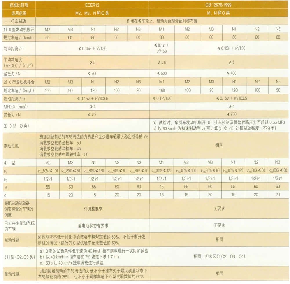 以下主要介绍ECER13 《关于M、N和O类车辆制动系统的认证的统一规定》与GB12676-1999《汽车制动系统结构、性能和试验方法》、GB/T 13594-2003《机动车和挂车防抱死制动性能和试验方法》之间的差异。