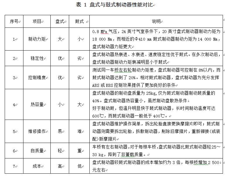 盘式和鼓式制动器在相同的制动工况下有显著的性能差异。与鼓式制动器相比,盘式制动器的最大优点是制动稳定性好,制动性能受外界影响小。盘式制动器允许的工作温度高,制动盘通风冷却较好,带通风孔的制动盘散热效果尤佳,直接把热量散发到空气,对轮毂温度升高影响不大。更换盘式的摩擦片容易,维修简便,甚至可以在现场进行,而对鼓式的类似的作业则复杂得多。新的盘式制动器装车后磨合的里程也比鼓式的要少许多。表 1为从7个方面对这两种形式的制动器进行考量、加以比较。
