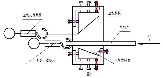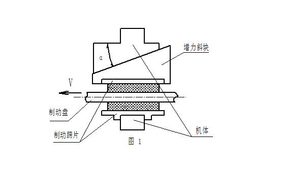 在制动盘的上面有增力斜块,制动盘的速度方向向左,一块制动蹄片固定在机体上,机体可以上下移动。另一块固定在增力斜块上,增力斜块可以左右移动。在未制动时,两制动蹄片与制动盘有间隙(气隙)。当制动时把增力斜块向左推,这时在控制力和制动力的作用下,制动器产生自增力。它的增力比公式为: