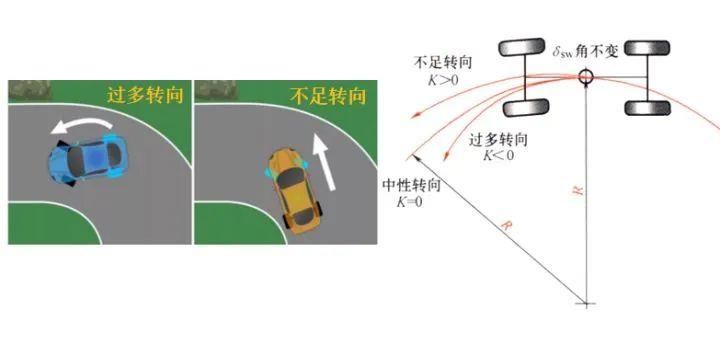 汽车的转向特性是衡量汽车高速操稳性的重要指标,人们把汽车稳态转向特性分为:不足转向、中性转向和过多转向。不足转向就是俗称的“推头”,而过多转向对应的是“甩尾”。三种转向特性的汽车具有如下特点(图1)∶在转向盘保持一个固定转角下,缓慢加速或以不同车速等速行驶时,随着车速的增加,不足转向汽车的转向半径 R 增大;中性转向汽车的转向半径维持不变;而过多转向汽车的转向半径则越来越小。