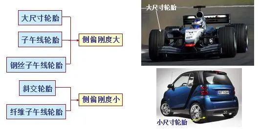 子午线轮胎的接地面比斜交轮胎的接地面宽,其侧偏刚度比斜交轮胎的要高。随着轮胎扁平率(轮胎断面高、宽之比H/B×100%)的减小,轮胎的侧偏刚度会增加,在同样侧偏力作用下,侧偏角会减下,车轮速度方向与车轮平面更接近。为了大幅提高轮胎的侧偏刚度,不少轿车采用扁平率为60系列宽轮胎,有些运动型轿车,采用50或40系列更宽的轮胎,以保证高速稳定性(图3)。假设希望某车增大不足转向特性,可采用减小前轮的侧偏刚度或增大后轮的侧偏刚度的办法,使a1-a2大于0。有的汽车后轮采用双胎,也是增大后轮侧偏刚度,以减小后轮侧偏角,增加不足转向特性的措施。