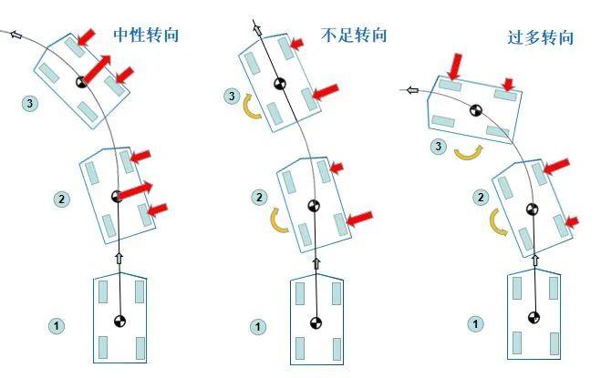 若前后轴重量按照50:50分配,那么前后轴产生的侧向力相同。前后轴侧向力不对整车产生额外的旋转力矩,车辆呈现中性转向特性。