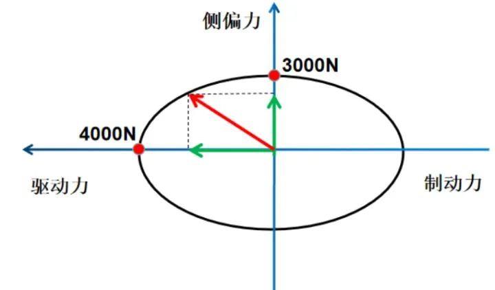 某车在直线行驶时,地面最大可以给车轮4000N的驱动力或者制动力(图5);若只转向,没有加速或制动时,地面最大可以给车轮3000N的侧向力。若既转弯又加速会怎么样呢?就是图中红色箭头的情况,侧偏力和纵向力都不能够达到其最大值。这么说吧,一个前驱的汽车,原本转一个弯需要地面提供给轮胎3000N的力能够转过去,而你在这时候加速了,侧向力就会变小,弯就过不去了,出现“推头”现象。所以有一种说法“前驱车容易出现转向不足,转不过弯”,其原因主要是前轮即是转向轮又是驱动轮,当驱动消耗了一部分附着后,地面不能提供足够的侧向附着力。发生“推头”现象后,只须驾驶员收小油门开度,即可减轻转向不足程度。