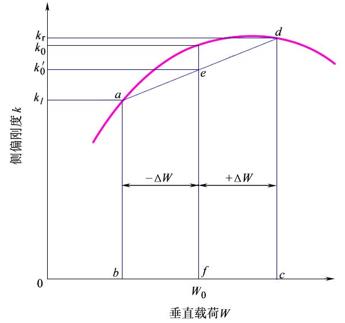 就单轴而言,车轴左、右车轮的垂直载荷均为W0(图7),每个车轮的侧偏刚度均为k0,地面侧偏力FY作用于两轮胎时,则相应的侧偏角为a0=FY/(2k0)。实际上,在侧向力作用下,左、右车轮垂直载荷均发生变化。内侧车轮减少DW,外侧车轮增加DW,左、右车轮的侧偏刚度随之变为kl、kr。由于左、右车轮的侧偏角相等,故有a=FY/(kl+kr),令kl+kr=k0’,即a=FY/(2k0’),显然,k0’<k0,即a>a0。分析可知,左右车轮载荷差别越大,轮胎的平均侧偏刚度越小。