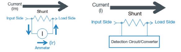 电路中的电流检测技术多种多样。其中最简单和最常见的方法之一是使用专用的检流电阻器。如下图所示,这种电阻器有两种用法。其一是图左侧的分流配置,其中大部分电流流经检流电阻器,而已知比例的电流流经电流表。该比例是已知电流表电阻和已知分流电阻的比例函数,因此可以计算出电路中的总电流。其二是图右侧的串联感测拓扑结构,其中所有电流都流经阻值较低的检流电阻器,再用高阻抗万用表测量其两端的电压。这样,电路中的总电流就可以运用欧姆定律轻松计算出来。