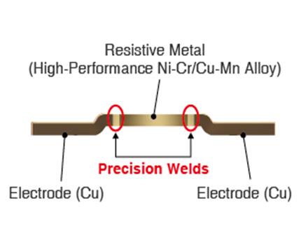 第二种方式是使用金属合金作为电阻结构,将其直接焊接到接触电极上。合金配方对于确定阻值及其热特性至关重要。这种电阻结构具有出色的功率和热性能表现,但其制造成本较高。下图给出了一个示例。