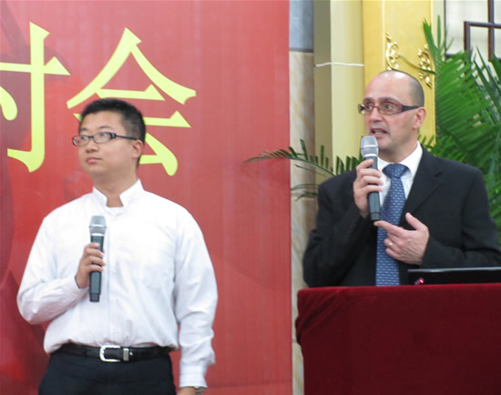 ↑Lapinus纤维公司上海办事处的外籍专家Arno kerssemakers介绍了“RB210-Roxul1000纤维对制动噪音的影响”, 康轶先生(左)进行中文翻译