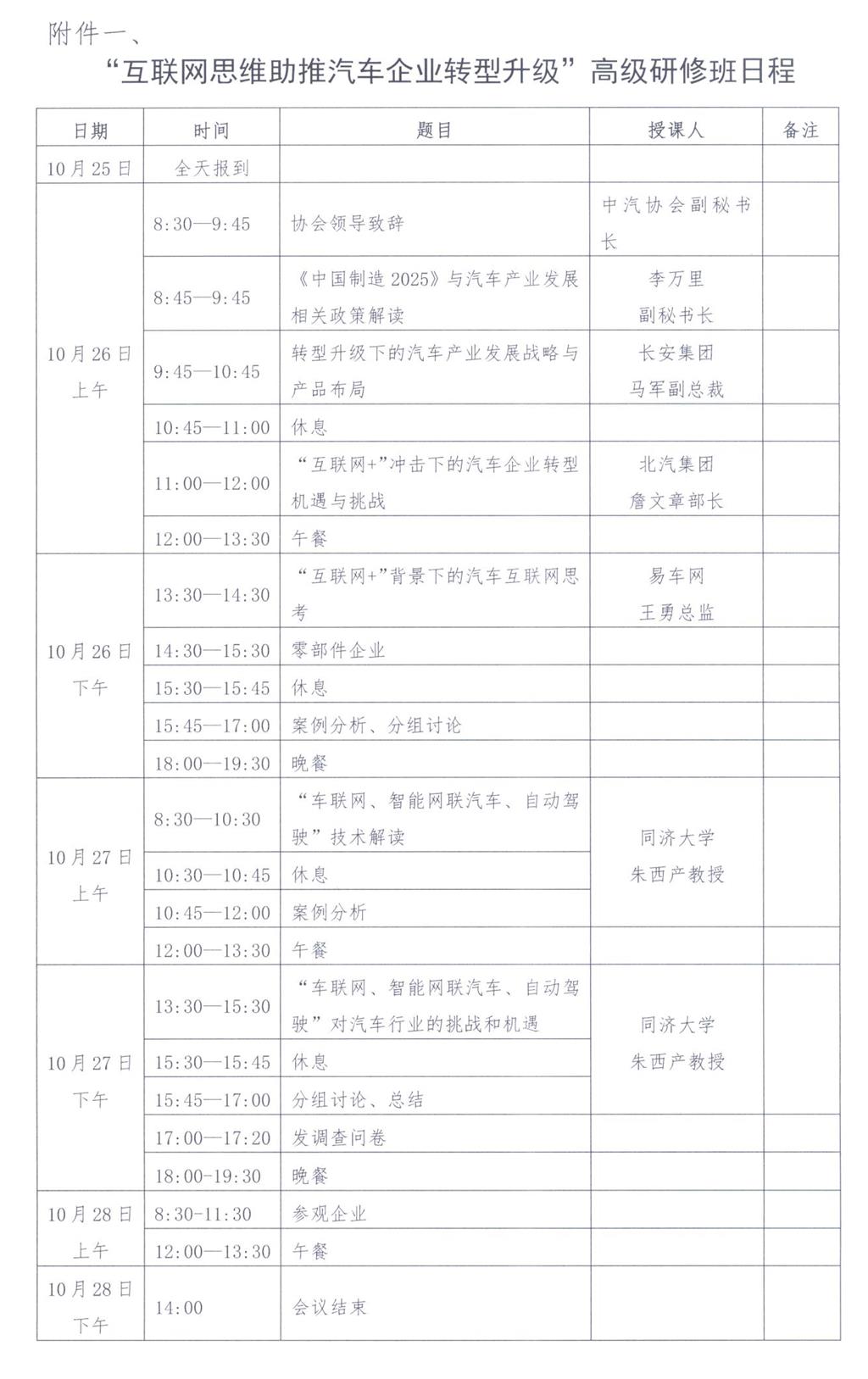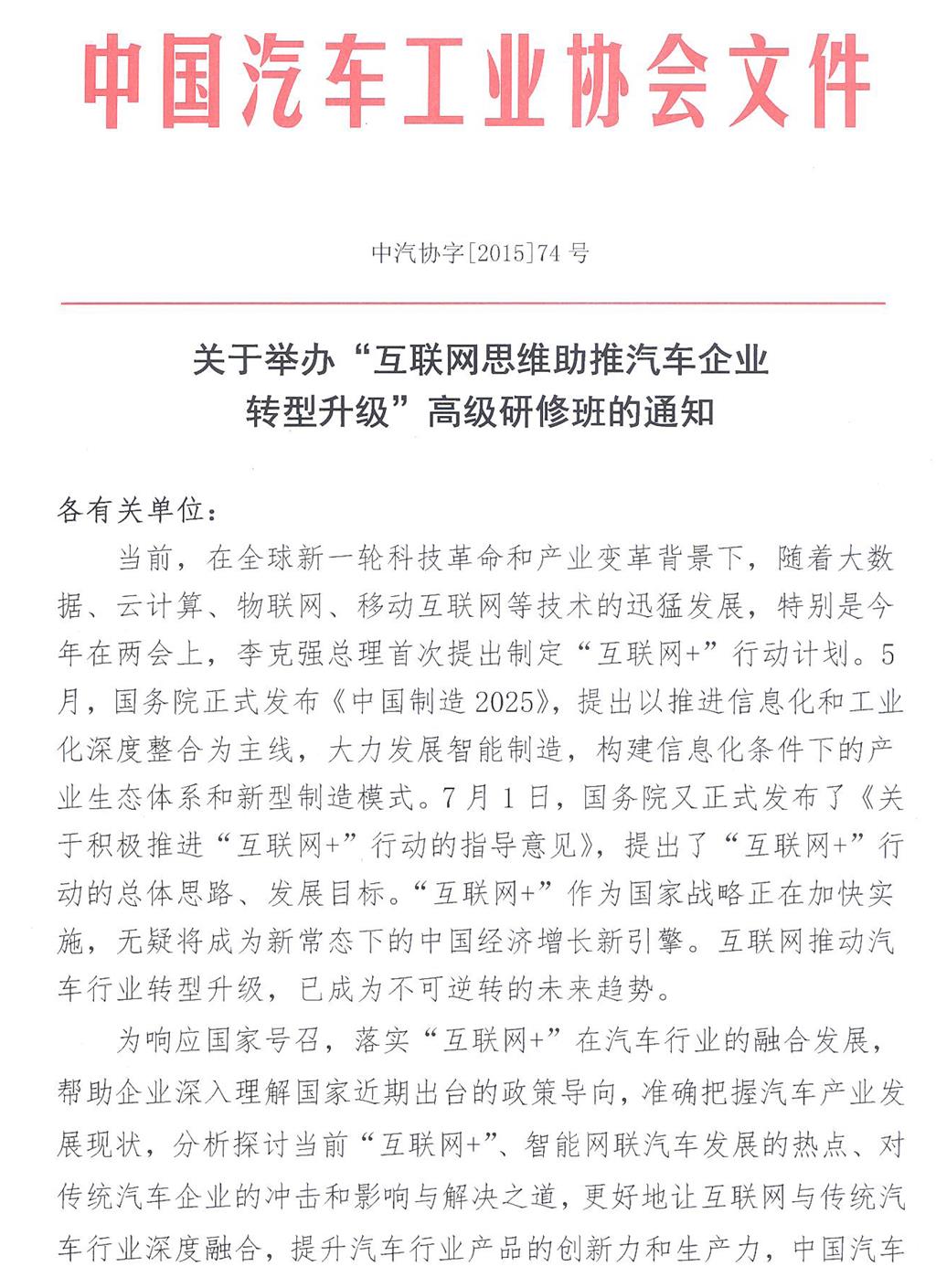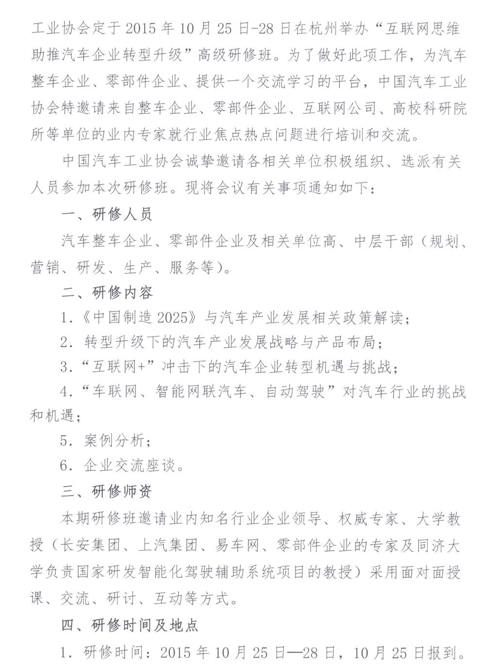 根据会员企业的需求,中国汽车工业协会经过半年调研及征求行业意见,拟定于2015年10月25日-28日在杭州举办“互联网思维助推汽车企业转型升级”高级研修班。
